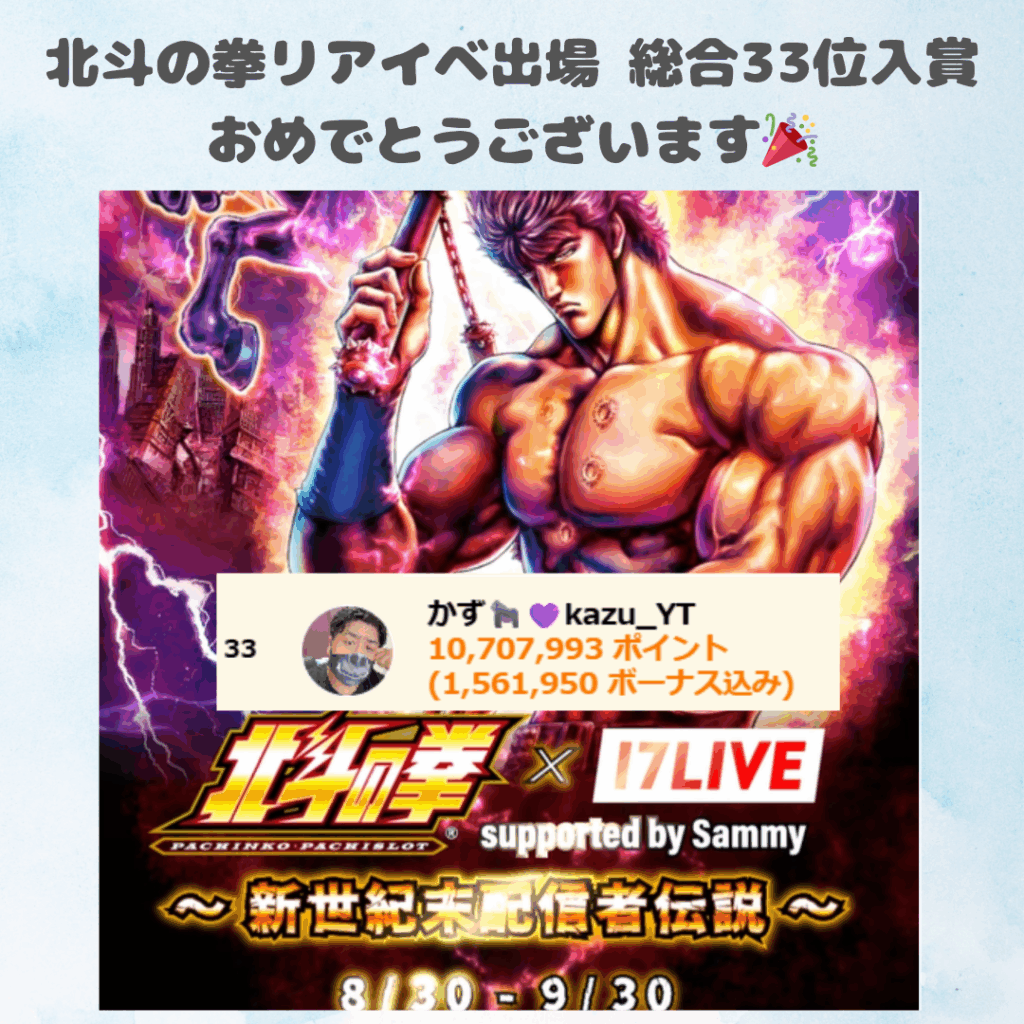 17LIVEにて弊社所属ライバーのかず🦍💜kazu_YTさんが8/30~9/30に行われました「北斗の拳×17LIVE」にてリアルイベント出場、総合33位に入賞されました。