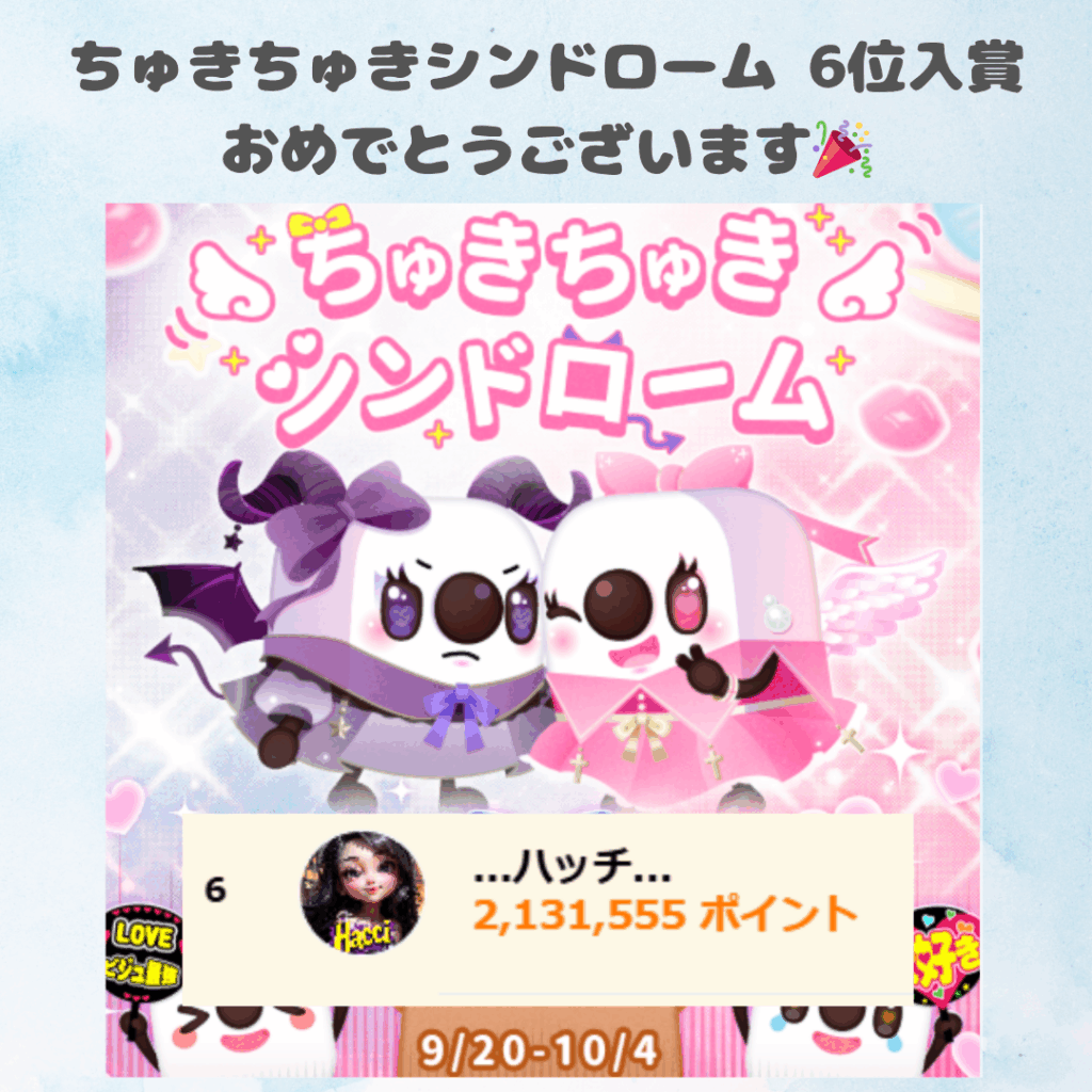 17LIVEにて弊社所属ライバーの…ハッチ…さんが9/20~10/4に行われました「ちゅきちゅきシンドローム」にて総合6位に入賞されました。