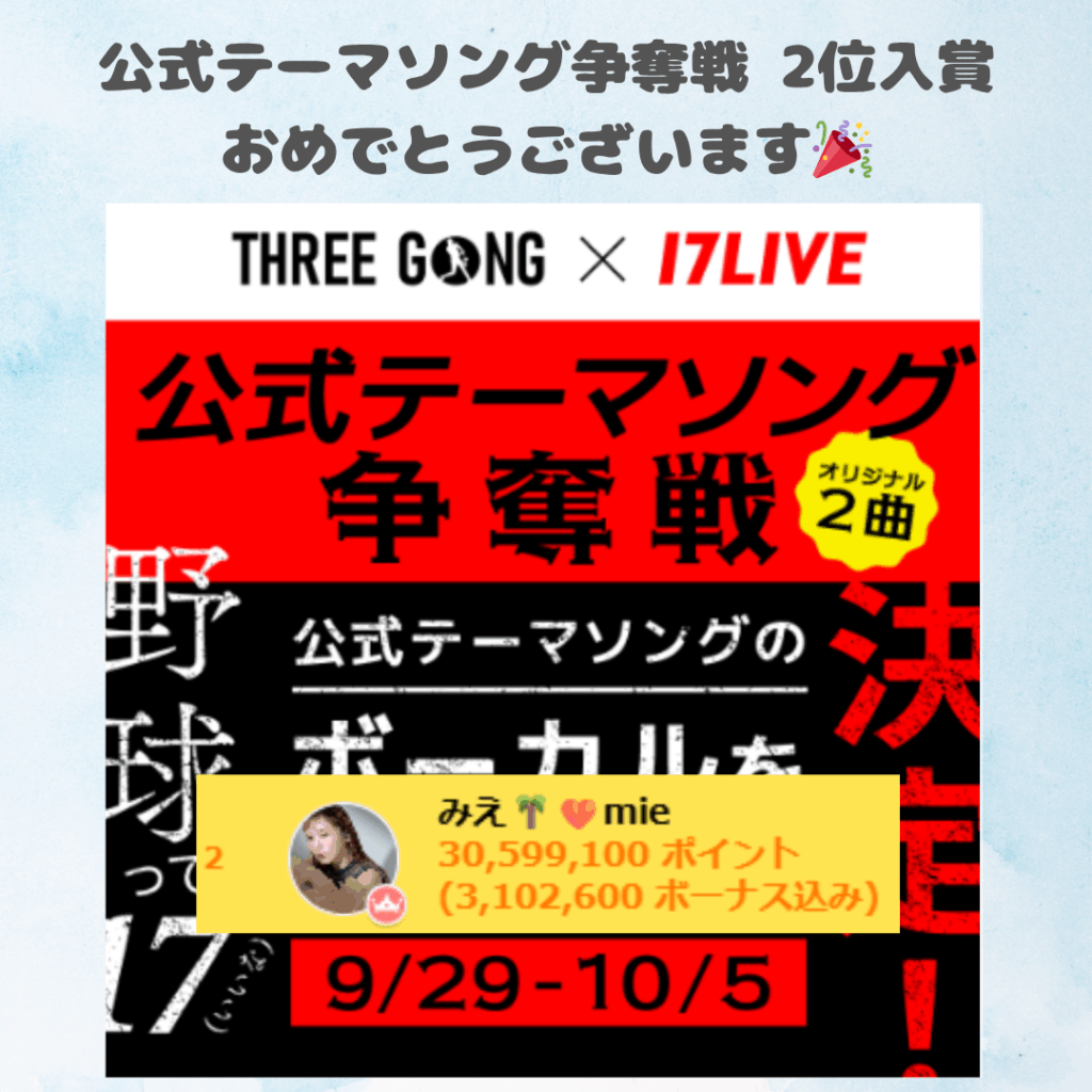 17LIVEにて弊社所属ライバーのみえ🌴🧡mieさんが9/29~10/5に行われました「公式テーマソング争奪戦 野球って17(いいな)」にて総合2位入賞されました。