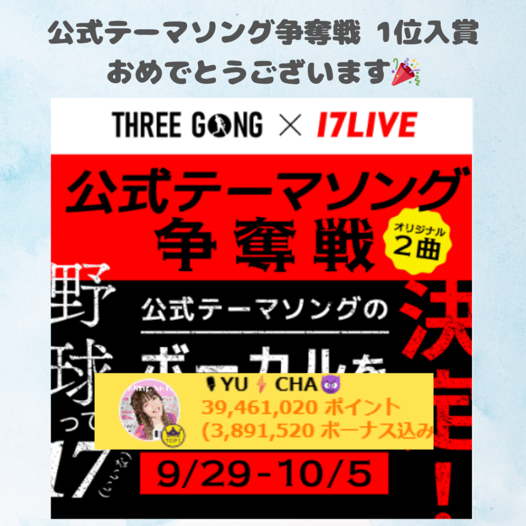 17LIVEにて弊社所属ライバーの🎙YU⚡️CHA😈さんが9/29~10/5に行われました「公式テーマソング争奪戦 野球って17(いいな)」にて総合1位入賞されました。