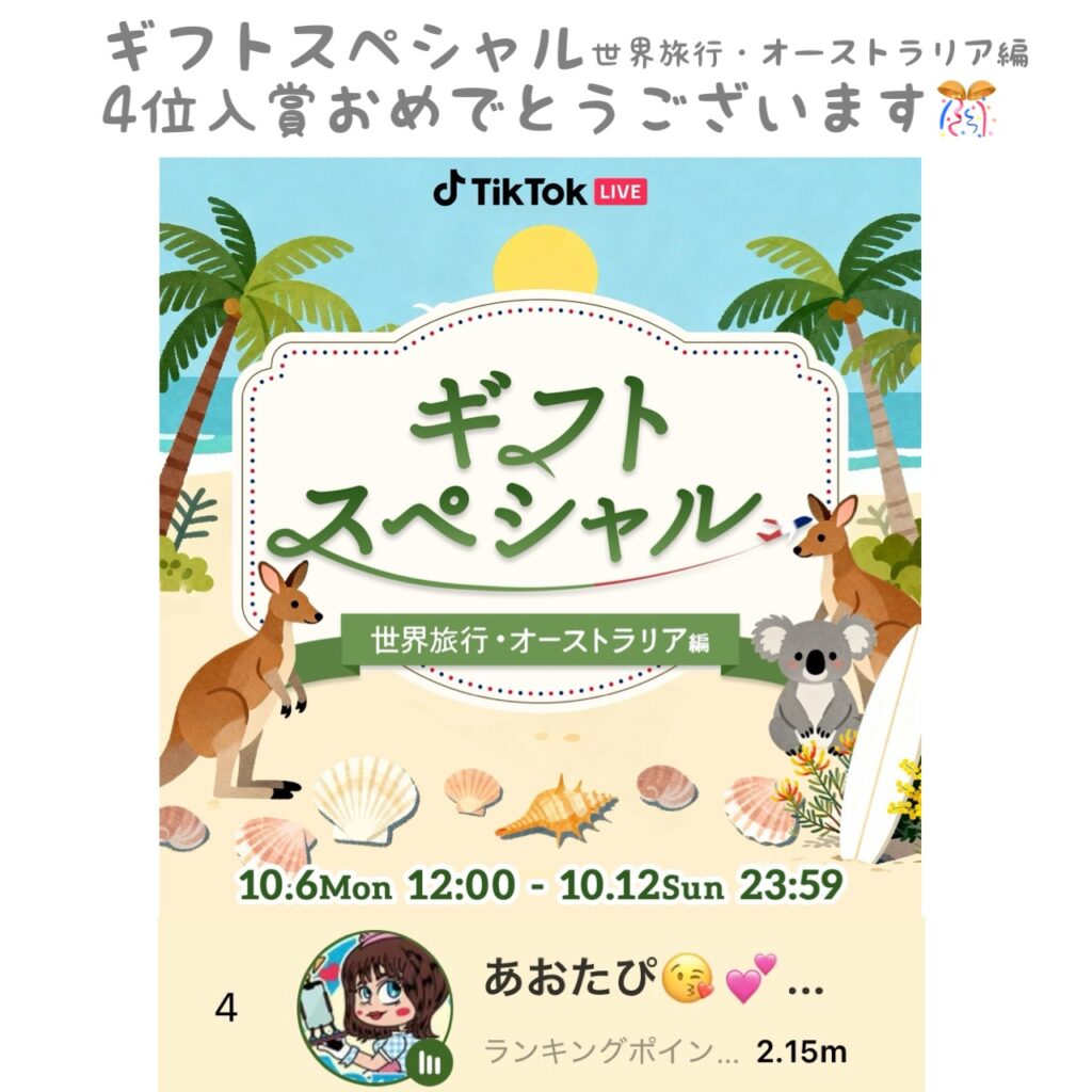 TikTok LIVEにて弊社所属LIVEクリエイターのあおたぴ😘💕💙さんが10/6~10/12に行われました「ギフトスペシャル 世界旅行•オーストラリア編」にて4位に入賞されました。