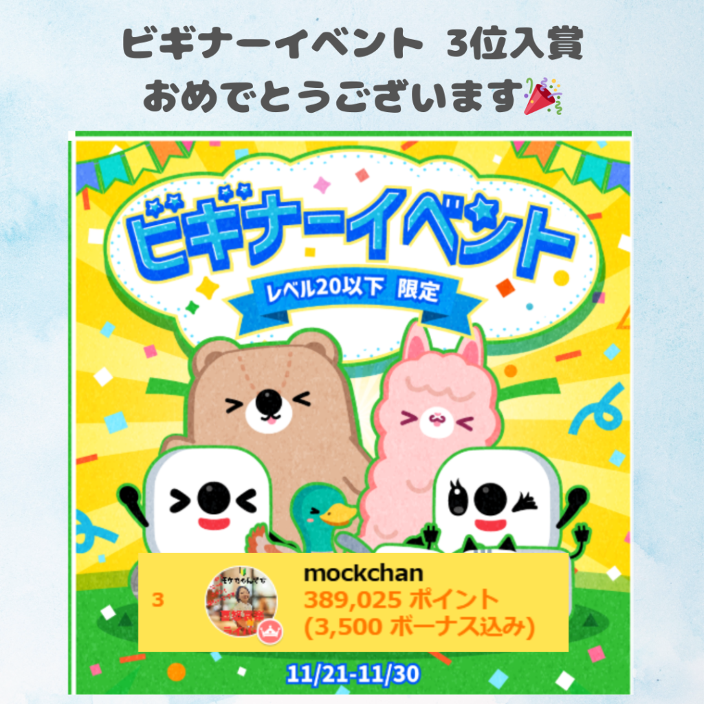 17LIVEにて弊社所属ライバーのmockchanさんが11/21~11/30に行われました「ビギナーイベント」にて総合3位に入賞されました。