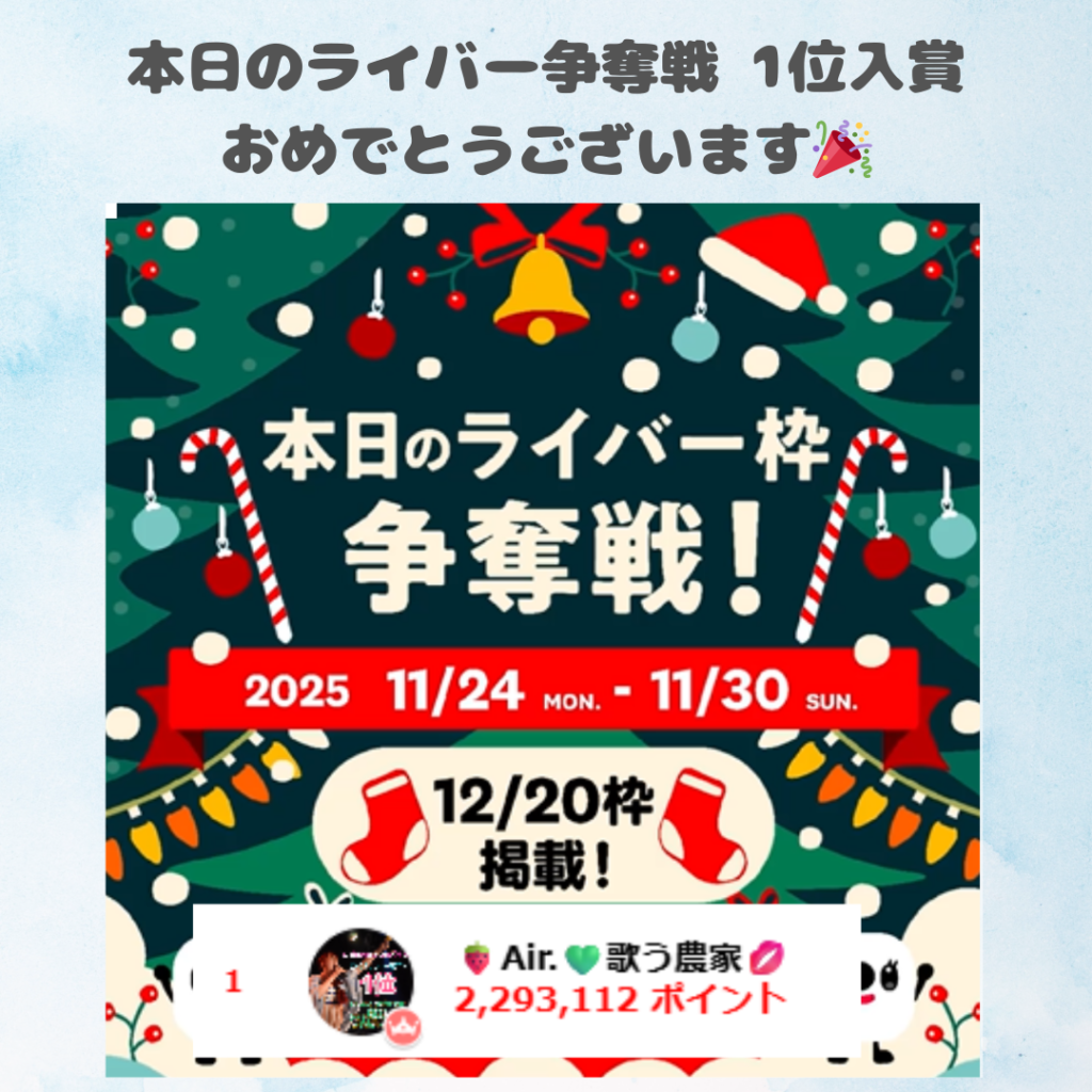 17LIVEにて弊社所属ライバーの🍓Air.💚歌う農家💋さんが11/24~11/30に行われました「本日のライバー争奪戦!」にて総合1位に入賞されました。