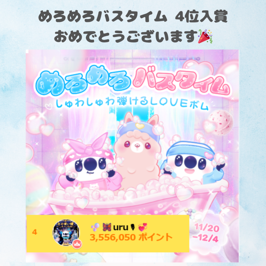 17LIVEにて弊社所属ライバーの🫧🦋‪uru🎙‪💞さんが11/20~12/4に行われました「めろめろバスタイム しゅわしゅわ弾けるLOVEボム」にて総合4位に入賞されました。