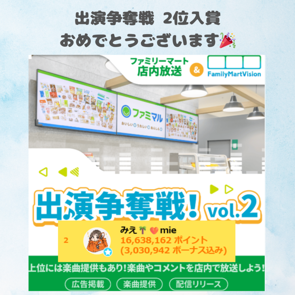 17LIVEにて弊社所属ライバーのみえ🌴🧡mieさんが11/29~12/13に行われました「ファミリーマート出演争奪戦!vol.2」にて総合2位に入賞されました。