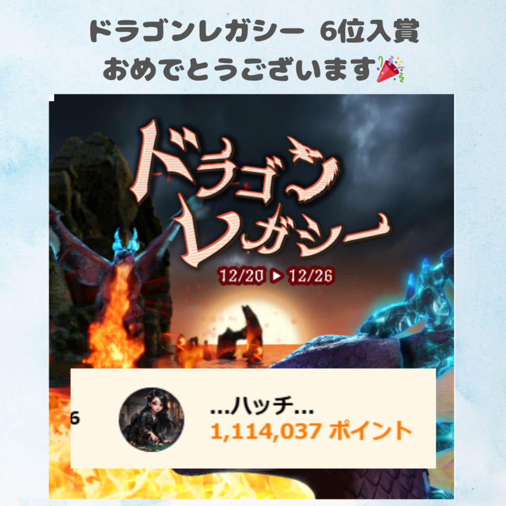 17LIVEにて弊社所属ライバーの…ハッチ…さんが12/20~12/26に行われました「ドラゴンレガシー」にて総合6位に入賞されました。