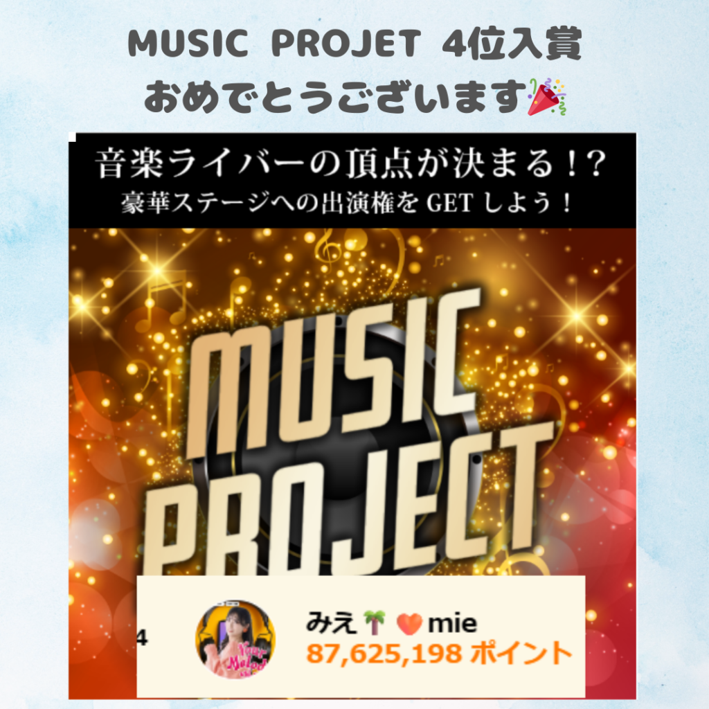 17LIVEにて弊社所属ライバーのみえ🌴🧡mieさんが9/29~12/28に行われました「MUSIC PROJE(2025.4th)」にて総合4位に入賞されました。
