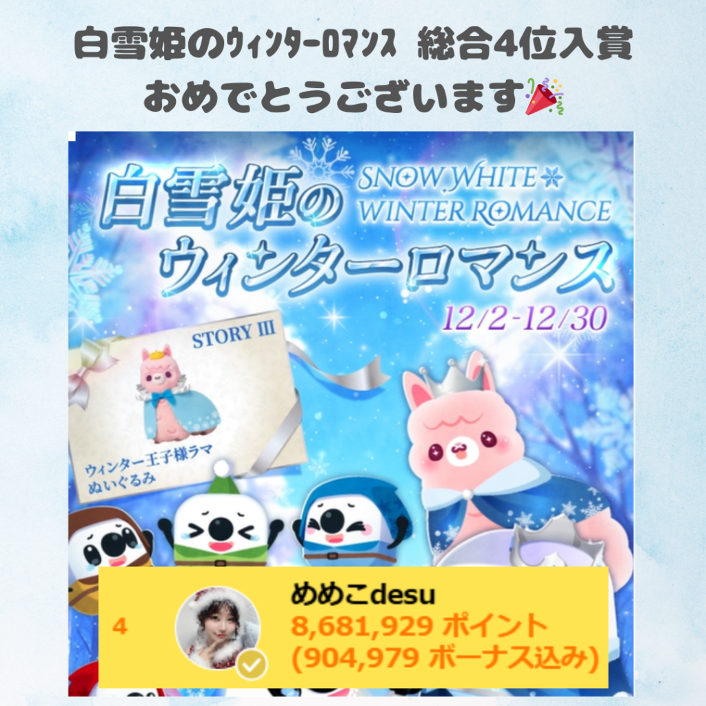 17LIVEにて弊社所属ライバーのめめこdesuさんが12/2~12/30に行われました「白雪姫ウィンターロマンス」にて総合4位に入賞されました。