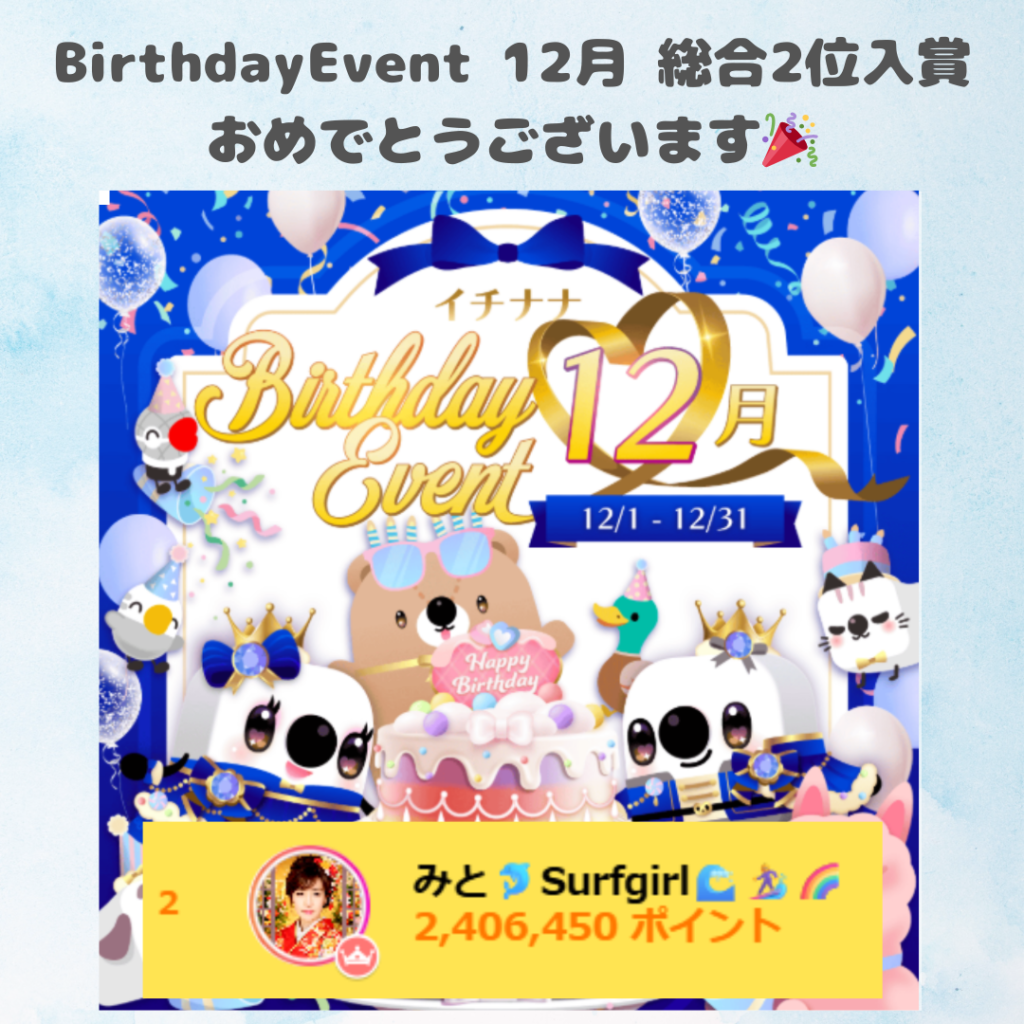 17LIVEにて弊社所属ライバーのみと🐬Surfgirl🌊🏄♀️🌈さんが12/1~12/31に行われました「BirthdayEvent」にて総合2位に入賞されました。