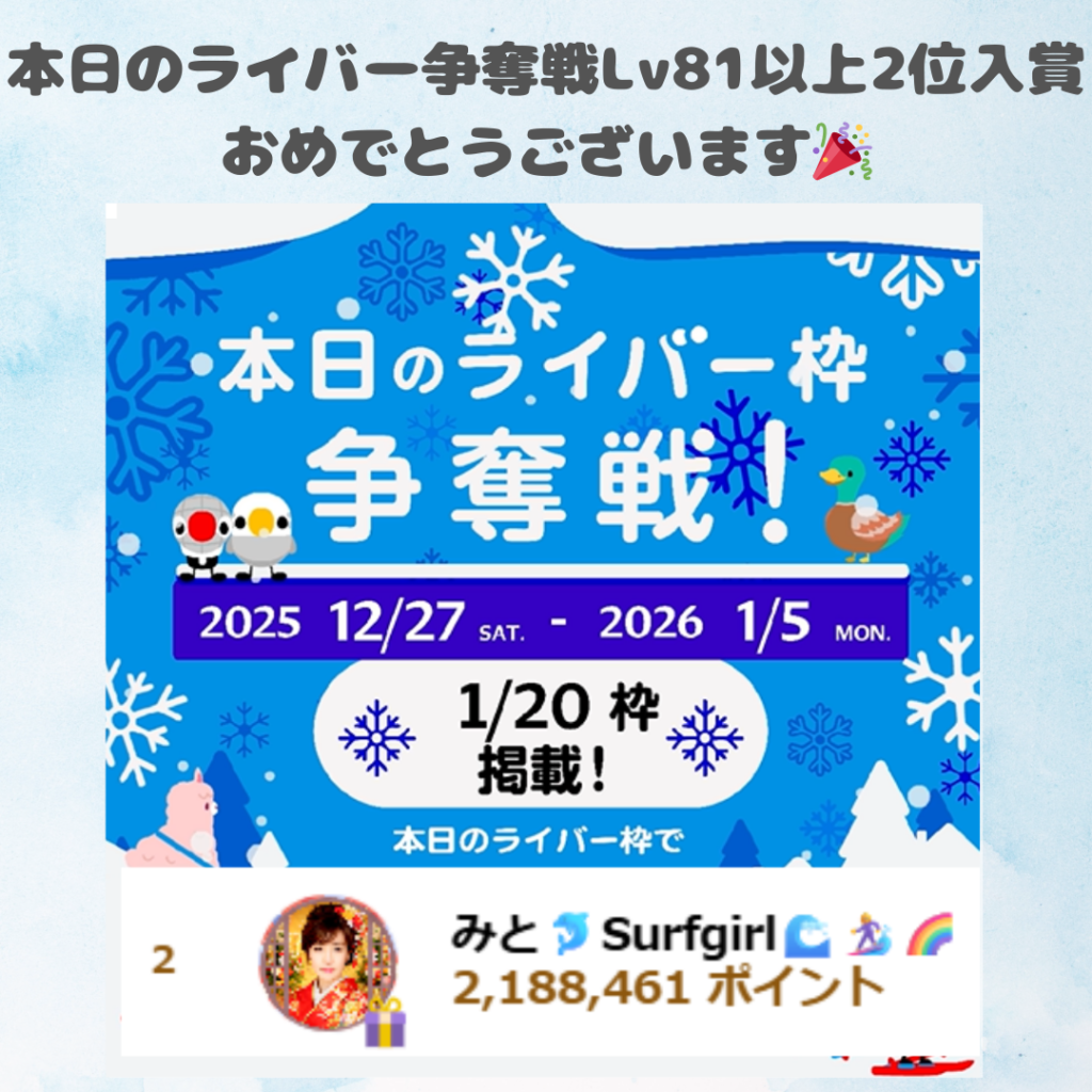 17LIVEにて弊社所属ライバーのみと🐬Surfgirl🌊🏄♀️🌈さんが12/27~1/5に行われました「本日のライバー争奪戦!Lv81以上」にて総合2位に入賞されました。