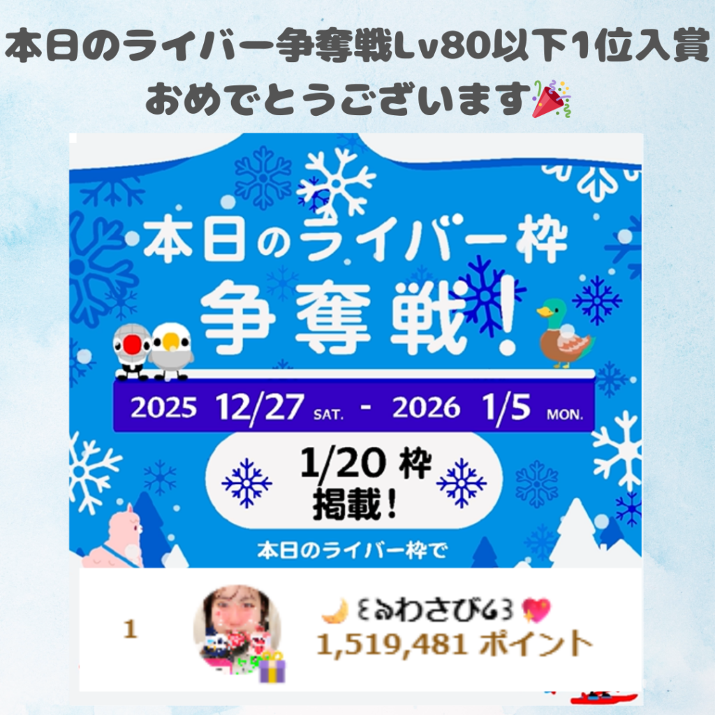 17LIVEにて弊社所属ライバーの🌙꒰ঌわさび໒꒱💖さんが12/27~1/5に行われました「本日のライバー争奪戦!Lv80以下」にて総合1位に入賞されました。