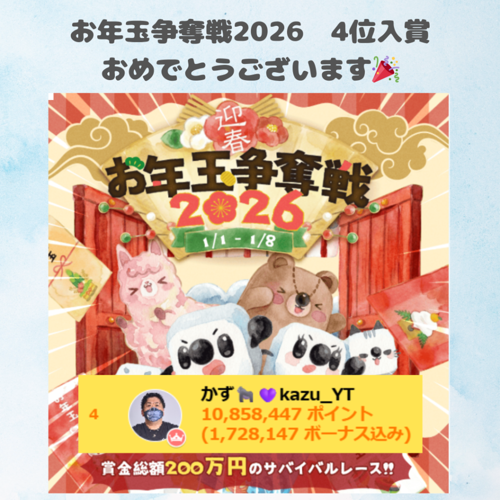 かず🦍💜kazu_YT「迎春 お年玉争奪戦2026」にて総合4位入賞