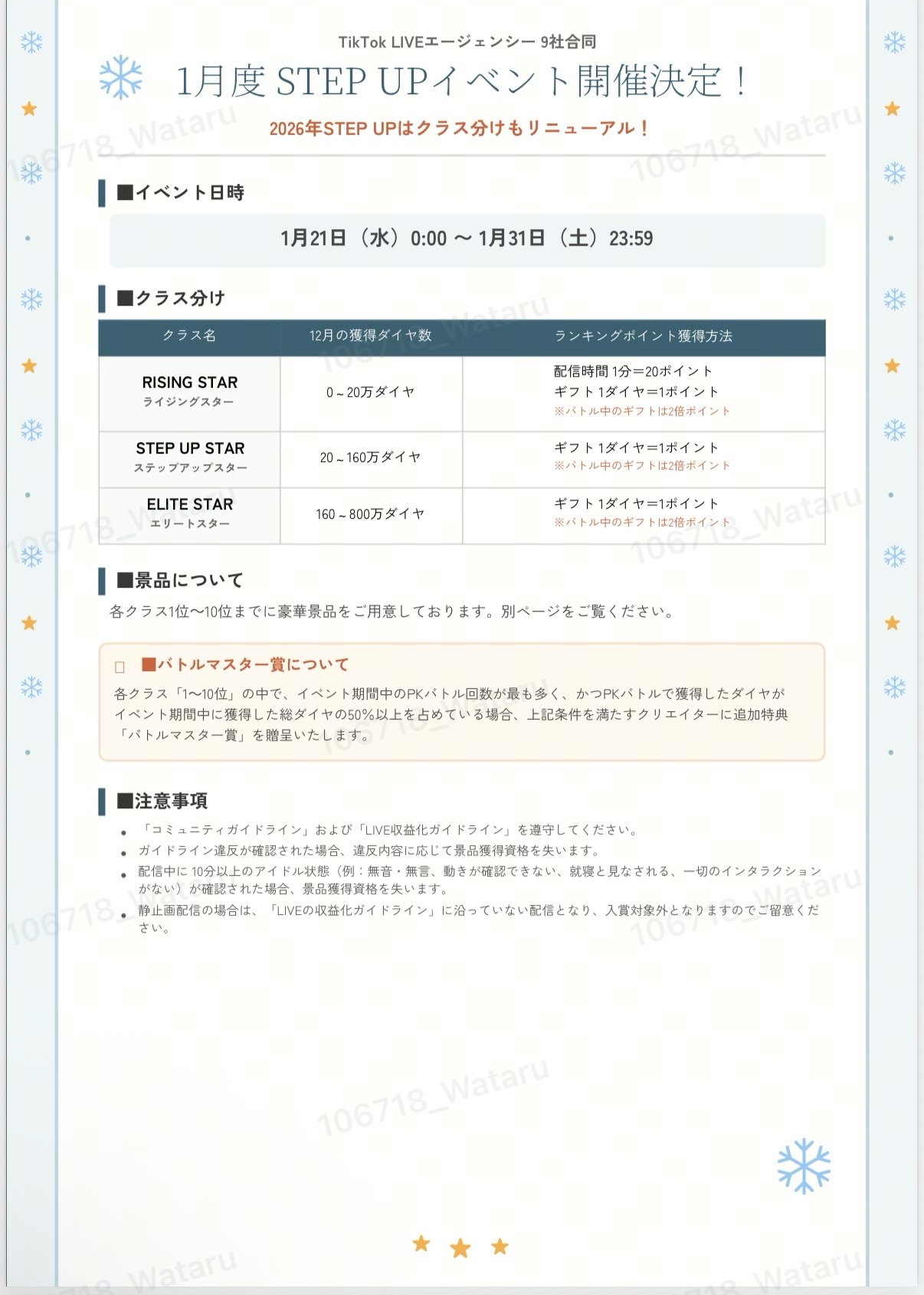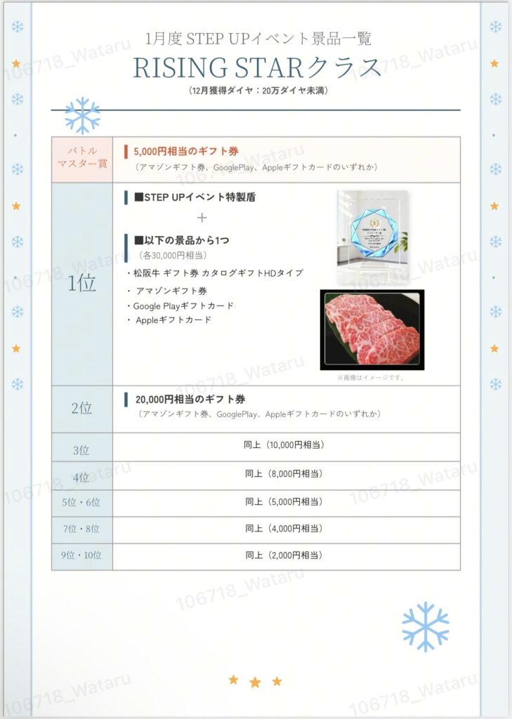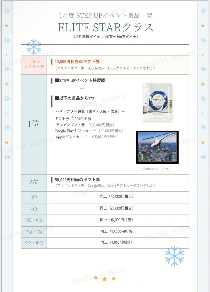 各クラス「1~10位」の中で、イベント期間中のバトル回数が最も多く、かつバトルで獲得したダイヤがイベント期間中に獲得した総ダイヤの50%以上を占めている場合、上記条件を満たすクリエイターに追加特典「バトルマスター賞」を贈呈いたします。