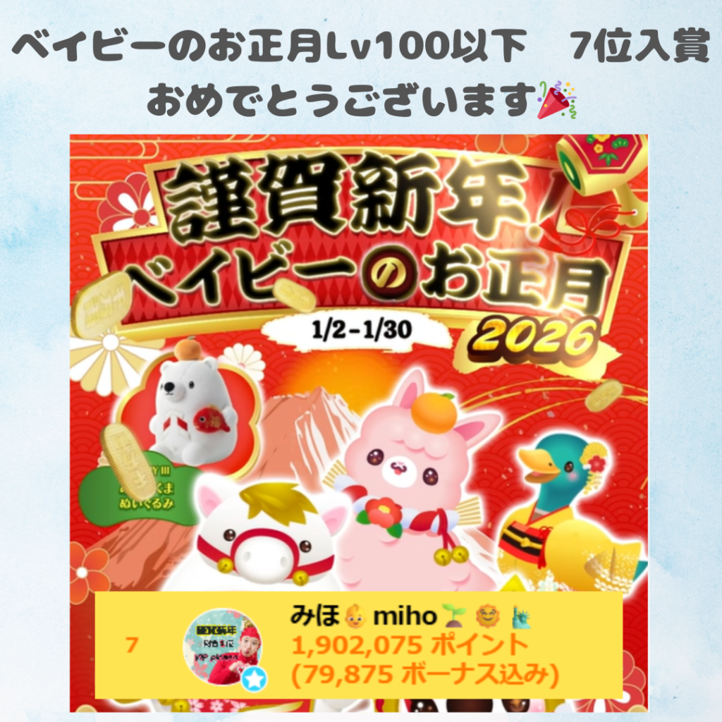 17LIVEにて弊社所属ライバーのみほ👶miho🌱🌞🗽さんが1/2~1/30に行われました「謹賀新年ベイビーのお年玉2026」にてLv100以下7位に入賞されました。