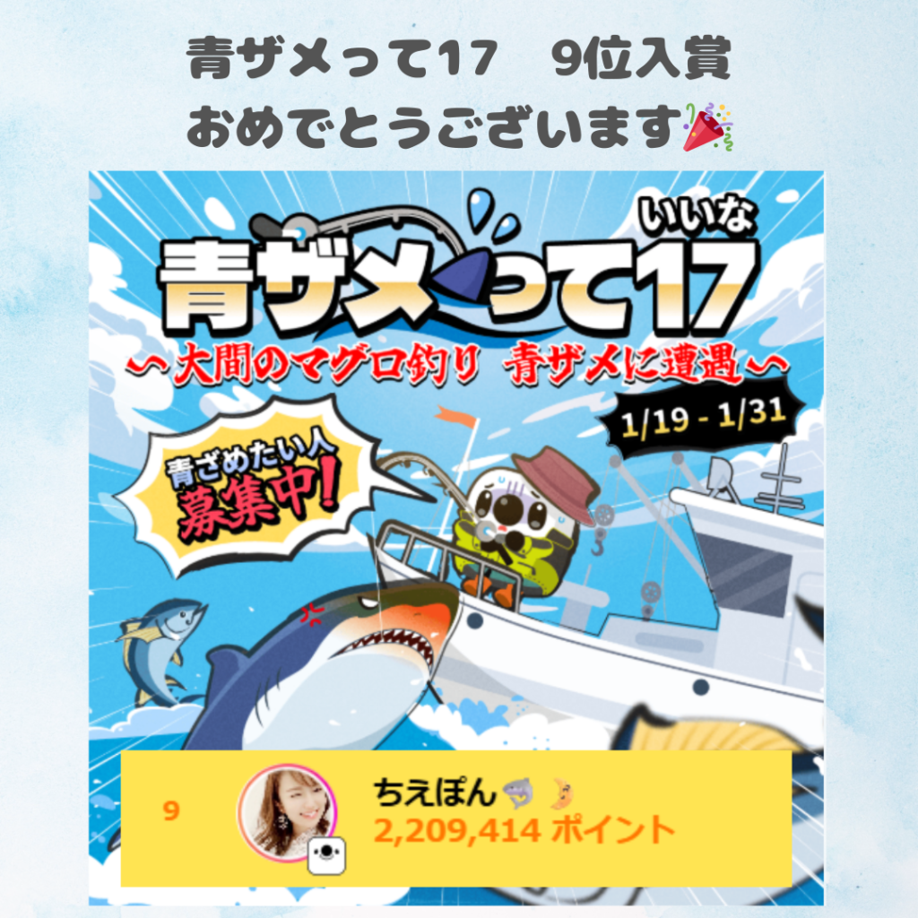 17LIVEにて弊社所属ライバーのちえぽん🦈🌛さんが1/19~1/31に行われました「青ザメって17」にて総合9位に入賞されました。