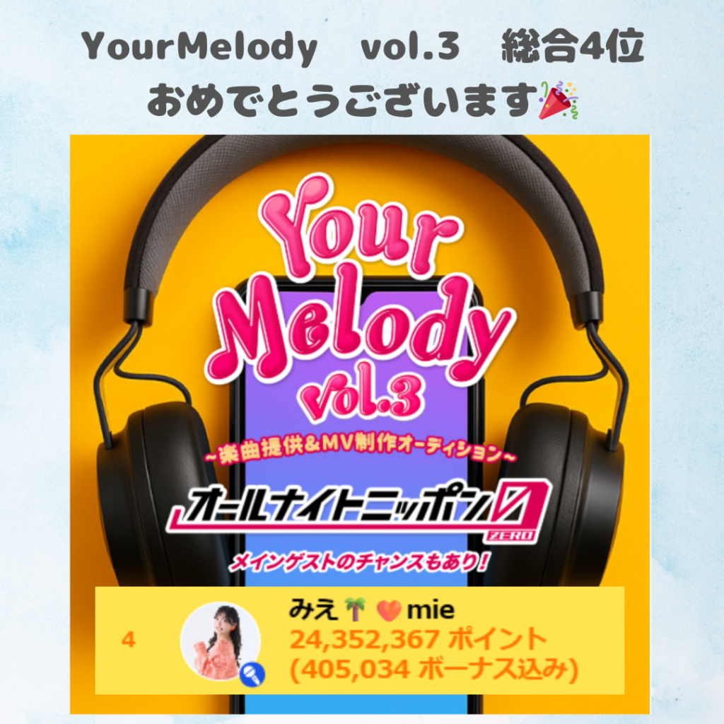 17LIVEにて弊社所属ライバーのみえ🌴🧡mieさんが1/29~2/11に行われました「YourMelody vol.3」にて総合4位に入賞されました。