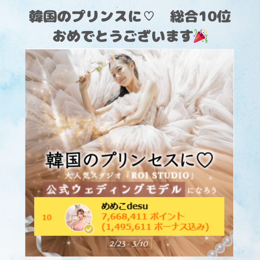 17LIVEにて弊社所属ライバーのめめこdesuさんが2/23~3/10に行われました「韓国のプリンセスに♡」にて総合10位に入賞されました。