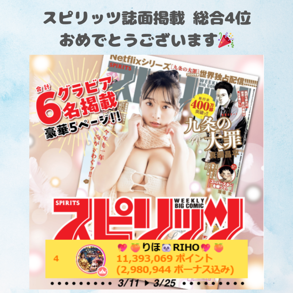17LIVEにて弊社所属ライバーの💖🍑りほ🐼RIHO💖🍑さんが3/11~3/25に行われました「スピリッツ 誌面掲載オーディション」にて総合4位に入賞されました。