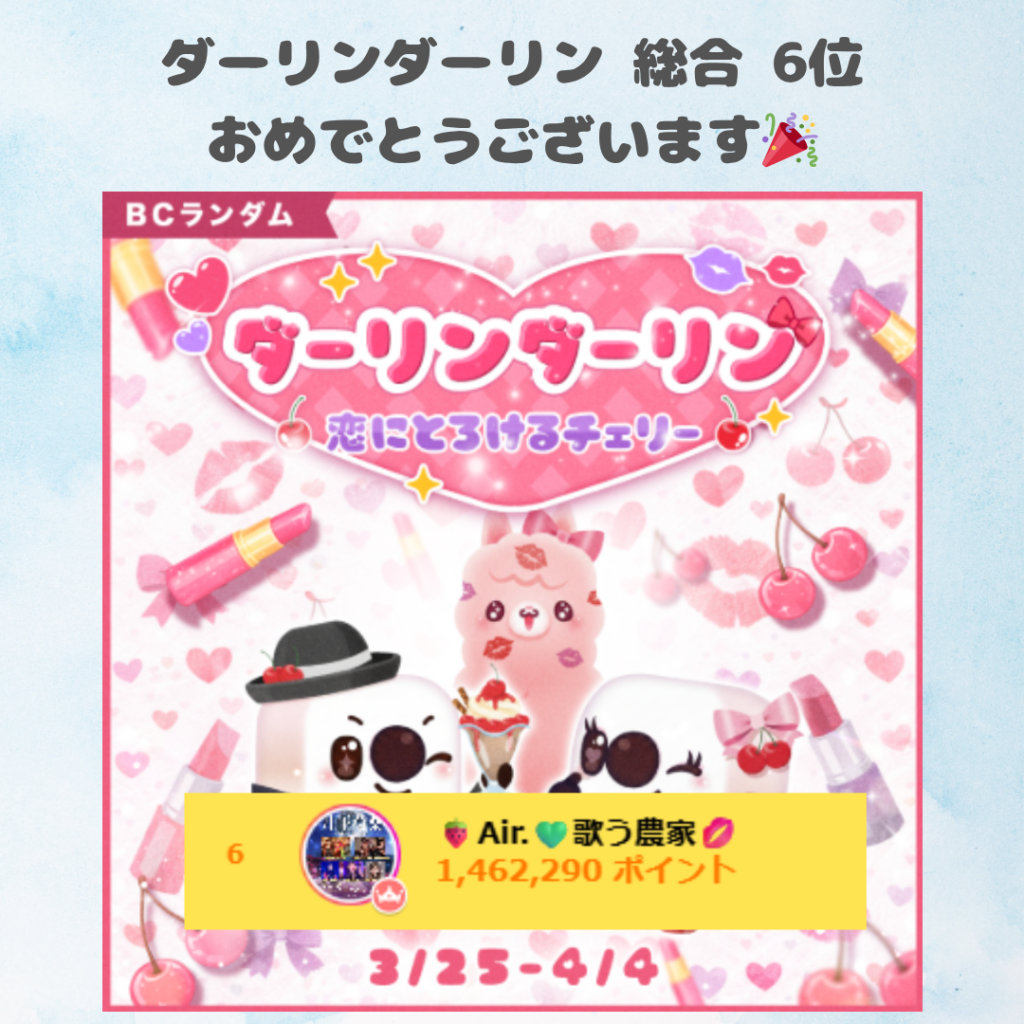 17LIVEにて弊社所属ライバーの🍓Air.💚歌う農家💋さんが3/25~4/4に行われました「ダーリンダーリン恋にとろけるチェリー」にて総合1位に入賞されました。