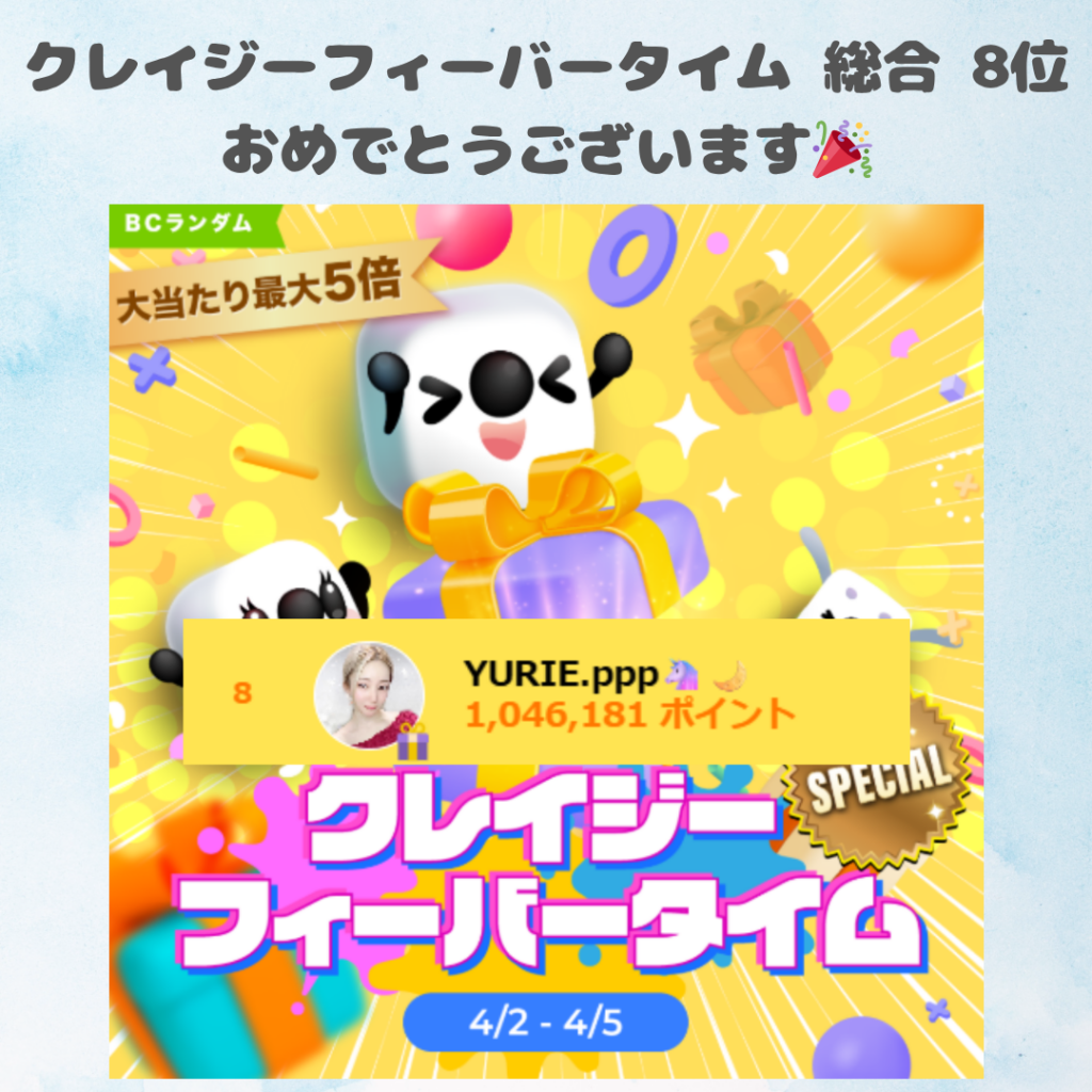 17LIVEにて弊社所属ライバーのYURIE.ppp🦄🌙さんが4/2~4/5に行われました「クレイジーフィーバータイム」にて総合8位に入賞されました。