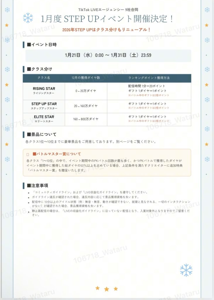 12月は50万ダイヤ以上のELITE STARを加えた3クラスに分かれて10社のTikTok提携エージェンシーで豪華プライズを目指します! ■イベント日時 12月20日(土)0:00~12月31日(水)23:59 ■ミステリー賞 各クラスの「1~10位」の中で、イベント期間中のバトル回... -